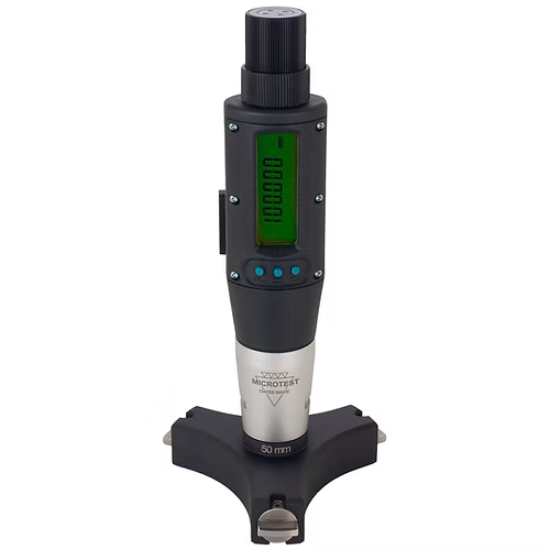 O sistema de medição MICROTEST® de alta precisão deve sua precisão aos três fusos de medição, que são usados simultaneamente durante a medição. A forte vibração gerada na catraca e transmitida aos botões através do sistema de fuso cria uma precisão de repetição independente da sensação de medição do utlizador.O revestimento de plástico protege o instrumento de respingos de água, sujeira e calor das mãos. O design com compensação de temperatura permite medições de alta precisão mesmo fora da temperatura ambiente padrão de 20°C, pois a expansão do material da peça e do instrumento de medição é quase completamente compensada. O sistema é isento de manutenção.